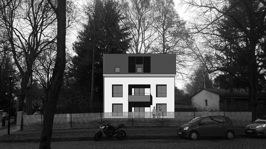 Neubau eines Mehrfamilienhauses in einer Gartenstadt am Nordrand von Berlin, mehr
