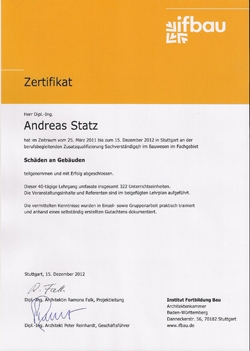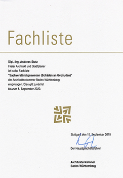| Als Sachverständiger für Schäden an Gebäuden berate ich Sie kompetent und unabhängig. Geprüft und zertifiziert als Sachverständiger durch erfolgreiche Teilnahme eines 22-monatigen Lehrgangs beim ifbau/Stuttgart sowie durch die erfolgreiche Prüfung mit Hochschulzertifikat der Hochschule Konstanz und der Architektenkammer Baden-Württemberg im Mai 2013. Aufnahme in die Fachliste "Sachverständigenwesen" der Architektenkammer Baden-Württemberg Schwerpunkte: